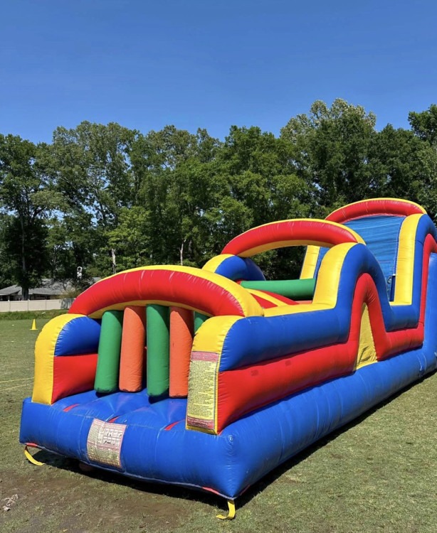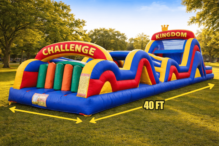 Challenge Kingdom is a large 40 foot, engaging inflatable play attraction that combines a colorful bounce area with a series of fun physical challenges, obstacles, and climbing elements for kids to conquer. Designed for group play at parties, school events, or community gatherings, it encourages active movement, friendly competition, and imaginative play. The unit’s layout typically guides participants through a sequence of activities—bouncing, dodging, climbing, and navigating obstacles—making it ideal for energetic children who love a mix of action and adventure. Sturdy construction and inflatable walls provide a safe contained space for supervised play, while the open design allows easy entry, exit, and visibility for adults monitoring the fun. Perfect for birthdays, team-building games, and lively outdoor events, Challenge Kingdom delivers a high-energy, memorable experience that keeps kids entertained for hours.